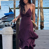 Robe longue violette Ă volants : lâĂ©lĂ©gance fluide en mouvement